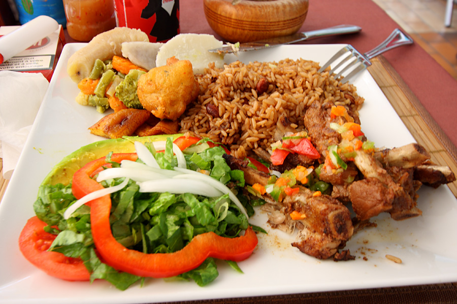 Das Essen ist super, aber extrem teuer. Spareribs mit Salat, Reis, Kartoffeln und ein paar regionalen Sachen. Kostet: 14 Euro.